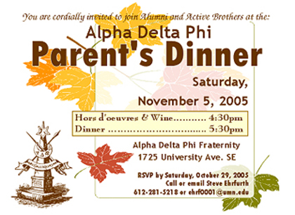 The Parent’s Dinner is a biannual event held at the chapter house where alumni and parents socialize over dinner that is fully prepared by the active brothers. This successful event is a good way to catch up on old times and to meet people for the first time.